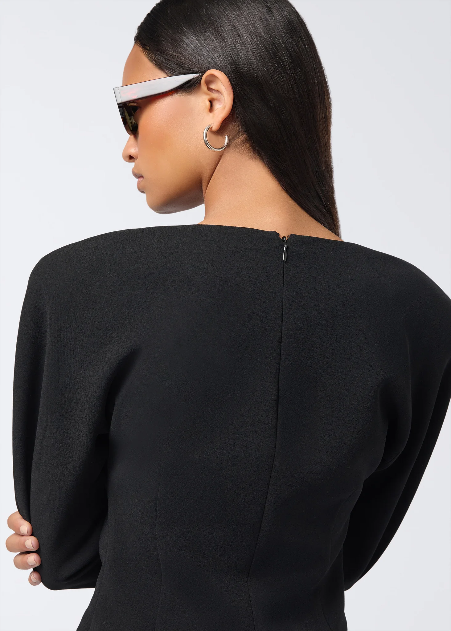 The Amanda rounded shoulder top is made from a black crepe fabric. Featuring exaggerated shoulders that extend down into 3/4-length sleeves, this women’s top is defined by its slightly oversized silhouette. A zip fastening and darts at the back ensure ease of wear.