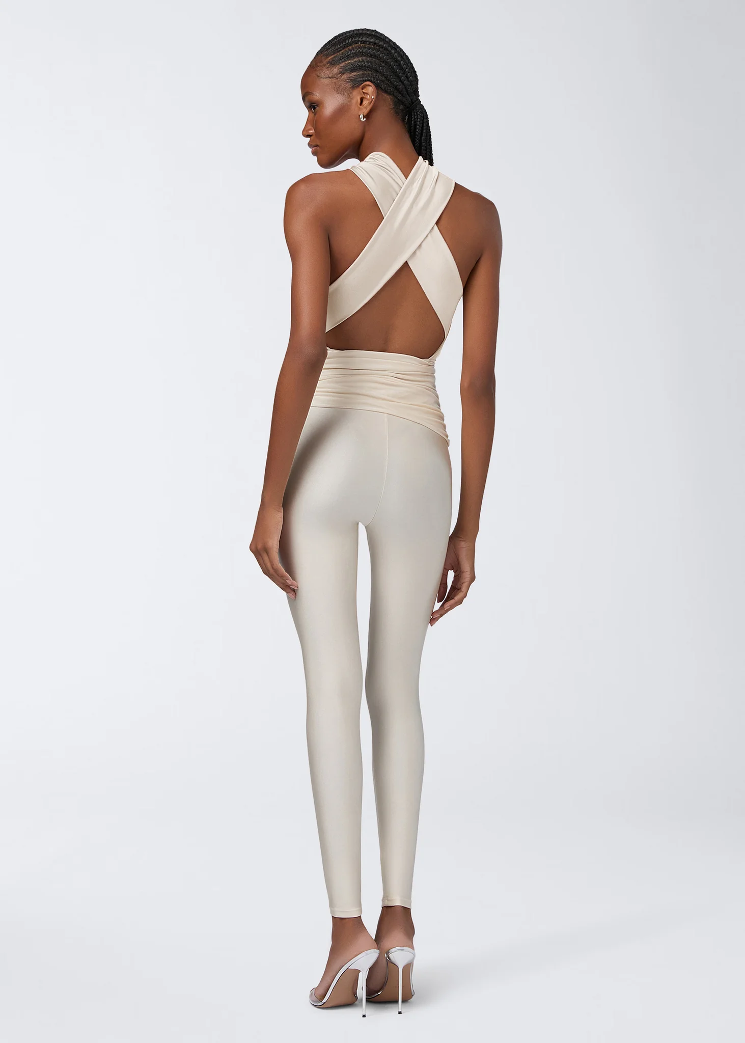 The Hola bodysuit is made from ivory shiny lycra. Featuring a distinctive cross-over halterneck design at both the front and back, this women's bodysuit exposes the skin while maintaining a feminine silhouette.