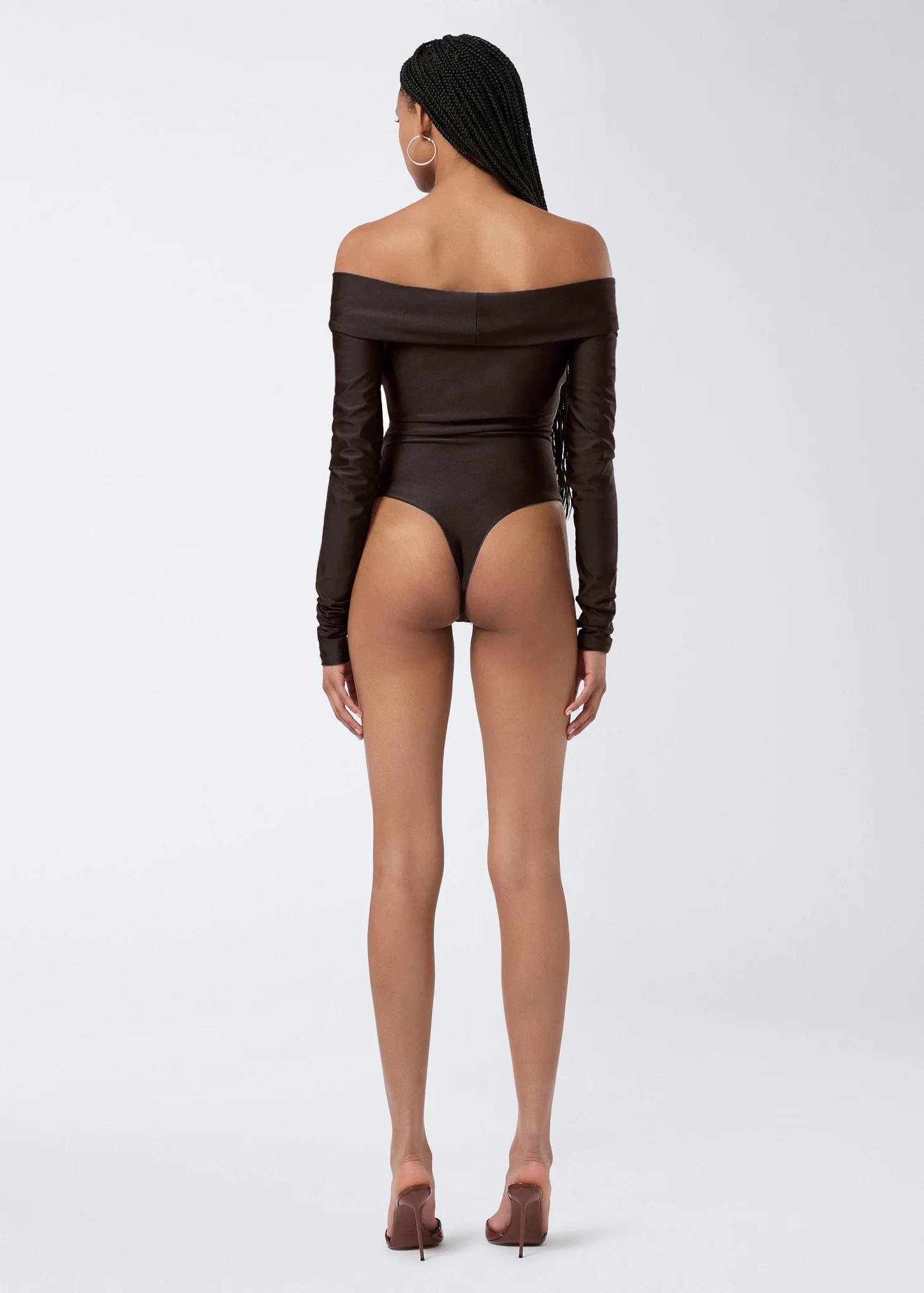 The Kendall off-the-shoulder bodysuit is made from dark brown shiny lycra. Extremely comfortable and stretchy, this women’s bodysuit features an off-the-shoulder neckline that flows into long sleeves and a knot detail at the front. Finished with draping around the chest, this bodysuit can be fastened at the bottom