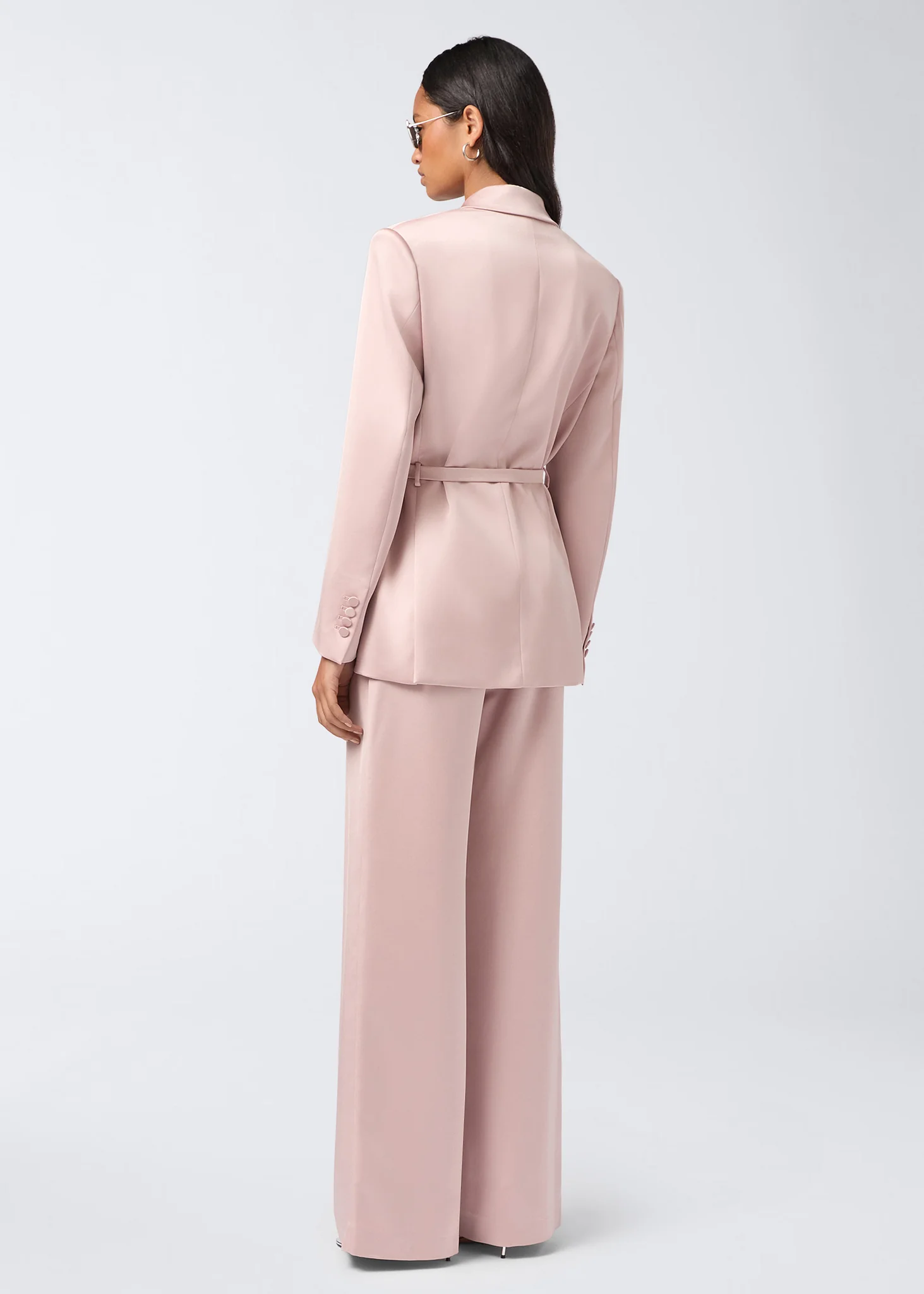 The Nathalie high-waisted pants are made from petal liquid satin. Detailed with darts down the front for a tailored aesthetic, these pants for women are complete with side slit pockets, belt loops, and a sliding hook and zip closure.
